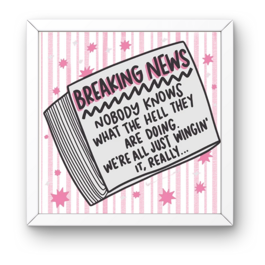 funny motivational wall art, breaking news quote print, relatable wall decor, inspirational humor poster, quirky framed artwork, stress relief gift idea, pink comic newspaper art, we’re all winging it frame, self-love wall print, cute funny desk art