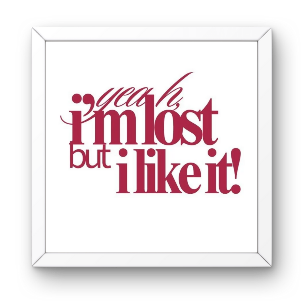 Celebrate your carefree spirit with this bold and confident I am Lost But I Like It Square Frame. Designed in striking typography and deep red tones, this print is perfect for anyone who loves to embrace the journey, even when it’s a little messy.