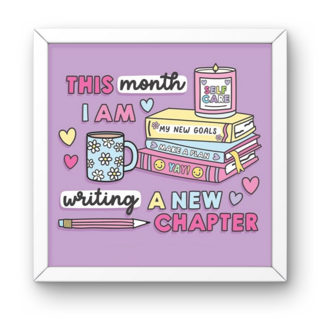 A charming New Chapter Purple Goals Frame print featuring pastel books, a floral mug, a pencil, and a self-care candle against a soft purple background. The artwork inspires you to set new intentions, make a plan, and embrace fresh beginnings.
