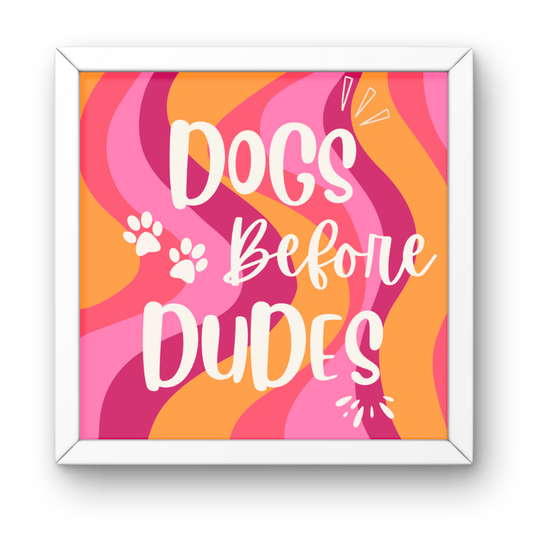 pinterest wall art, dogs before dudes print, cute dog lover decor, retro pink orange wall art, groovy aesthetic frame, kawaii pet decor, 5×5 pinterest frame, sassy dog quote art, girly home decor, pink orange retro print