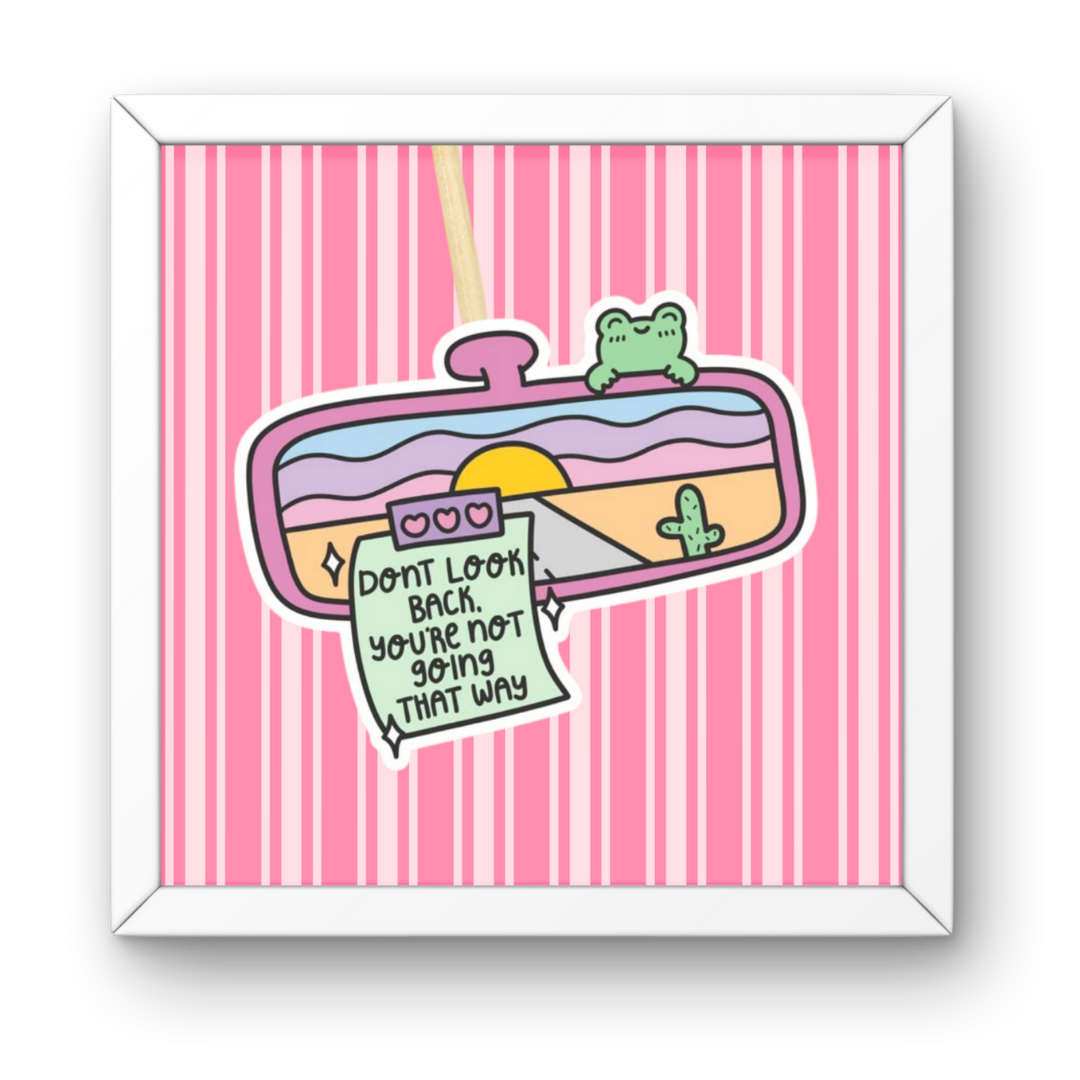Brighten up your space with this Rearview Mirror Frame. Featuring a playful pink striped background, retro-inspired rearview mirror with a desert sunset view, and the motivational reminder “Don’t look back, you’re not going that way”. A quirky, colorful piece that blends positivity with aesthetic vibes.