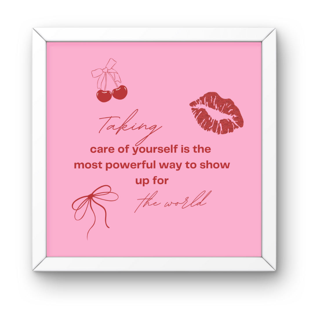 Brighten your space and uplift your mindset with this Taking Care of Yourself Pinterest Frame. Featuring the quote “Taking care of yourself is the most powerful way to show up for the world,” this Pinterest-style frame blends elegant script with bold red lettering, accented by cherry, bow, and lipstick kiss illustrations. A chic reminder to prioritize self-love.