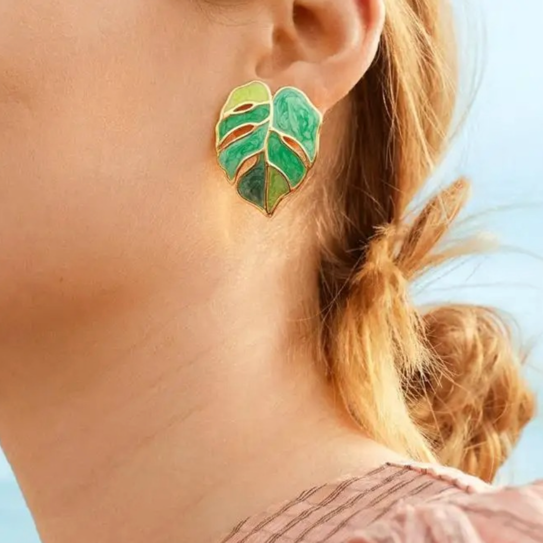 Channel your inner island girl with these Korean-style tropical leaf korean earrings 🌴✨. Designed with a perfect mix of glossy green hues and golden accents, they’re the statement piece you didn’t know your outfit needed.