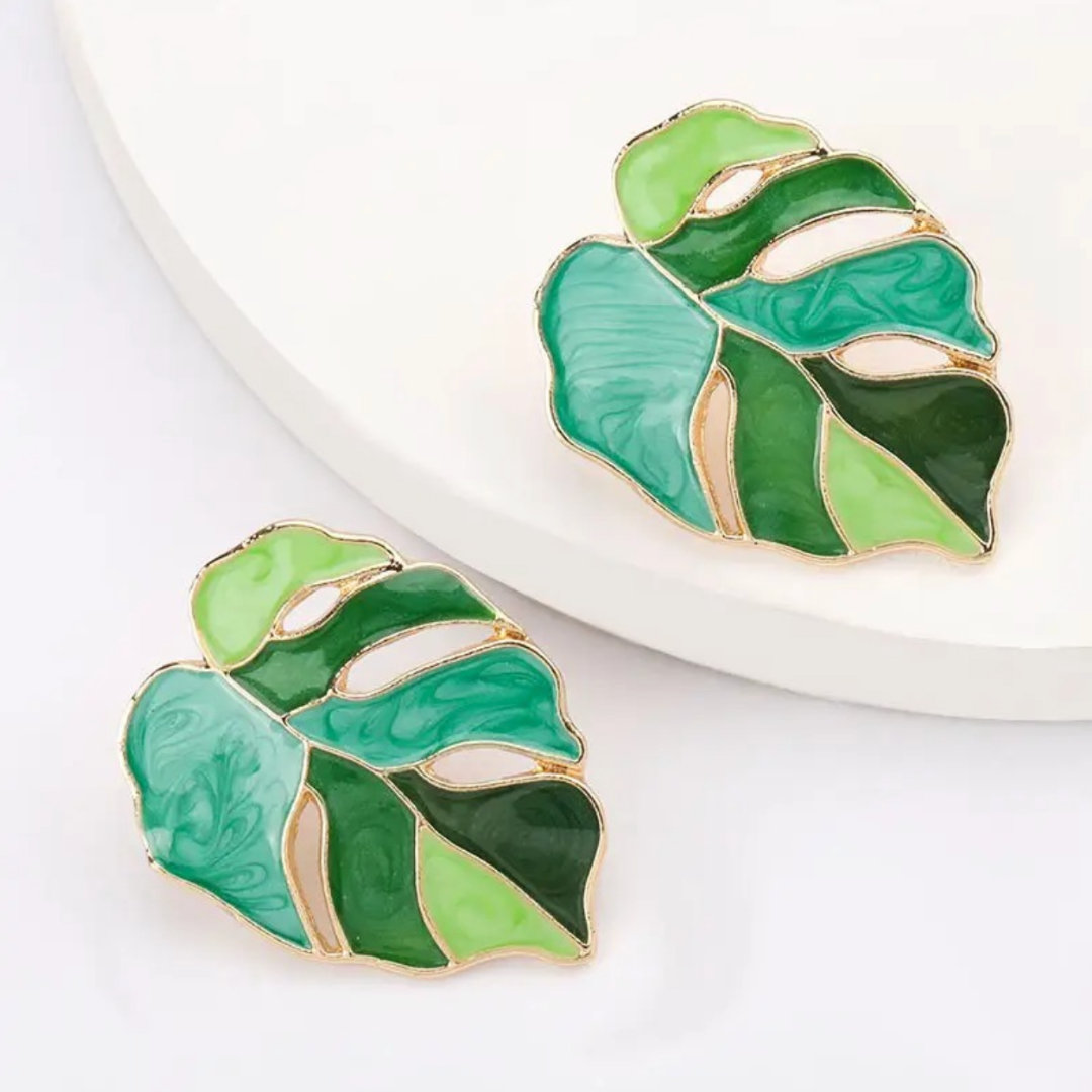 korean earrings, aesthetic earrings, green leaf earrings, monstera leaf earrings, tropical earrings, statement earrings, korean fashion jewelry, cute earrings for girls, pinterest earrings, enamel earrings, green aesthetic jewelry, trendy earrings for women, leaf stud earrings